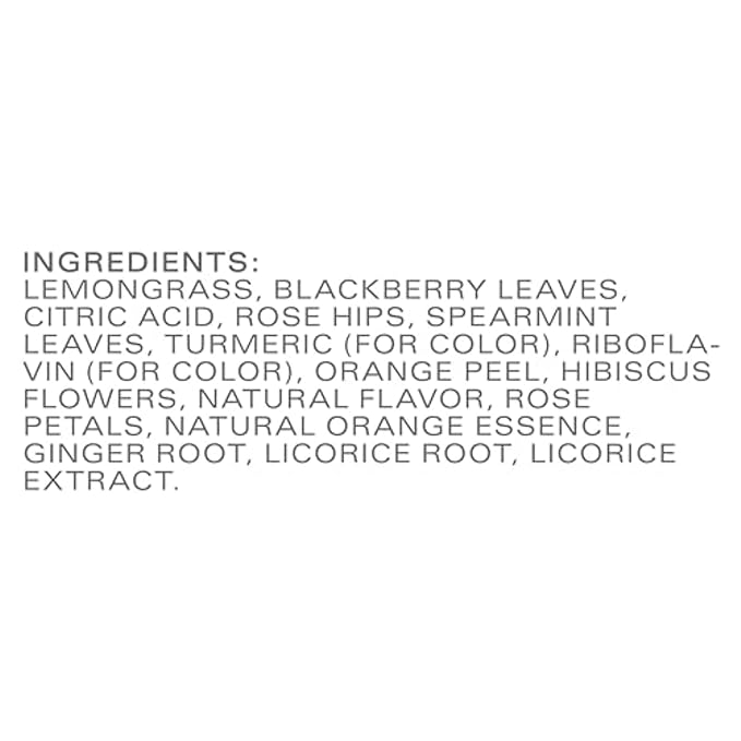 • DELICIOUS FLAVOR: Herbal hot tea bags offer a vibrant blend of orange peel, lemongrass, blackberry leaves, spearmint, hibiscus, rose petals, ginger and licorice root, creating a tangy, tasty herbal tea