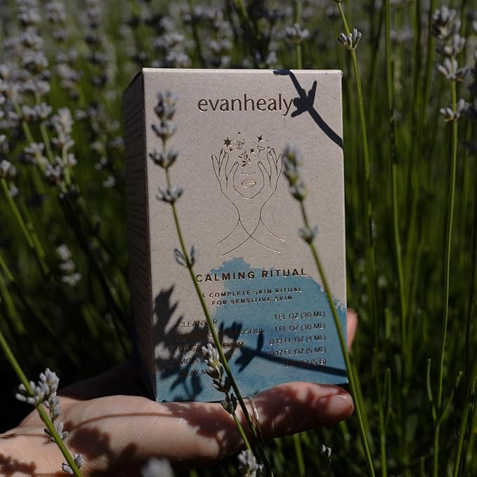 - SKIN TRINITY - Contains 5 travel-size essentials for the evanhealy oil water clay ritual: Blue Lavender Cleasing Milk organic face wash, Lavender Facial Tonic HydroSoul, Rosehip Facial Serum ~ Blue, Blue Chamomile Day Moisturizer, and Green Tea clay face mask.