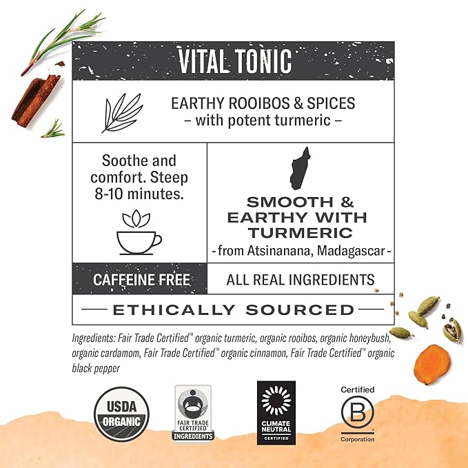 • Golden Turmeric: Blended entirely with real organic ingredients this herbal teasan combines turmeric, rooibos, cardamom, vanilla and cinnamon offering mellow apple notes with a sweet peppery zest