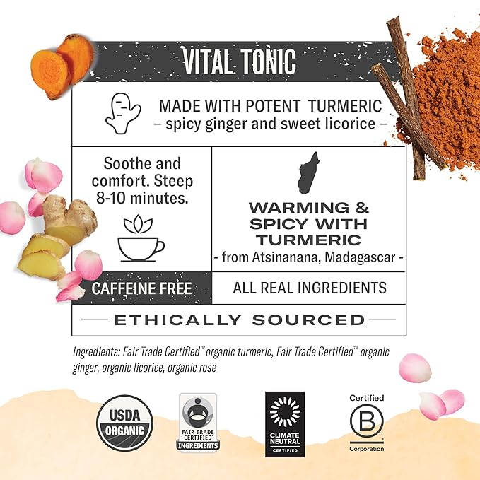 • Morning Afternoon or Evening: It's always a good time to enjoy a cup of this caffeine free herbal teasan; Healthful turmeric revitalizes the mind and balances the body; Enjoy hot or iced