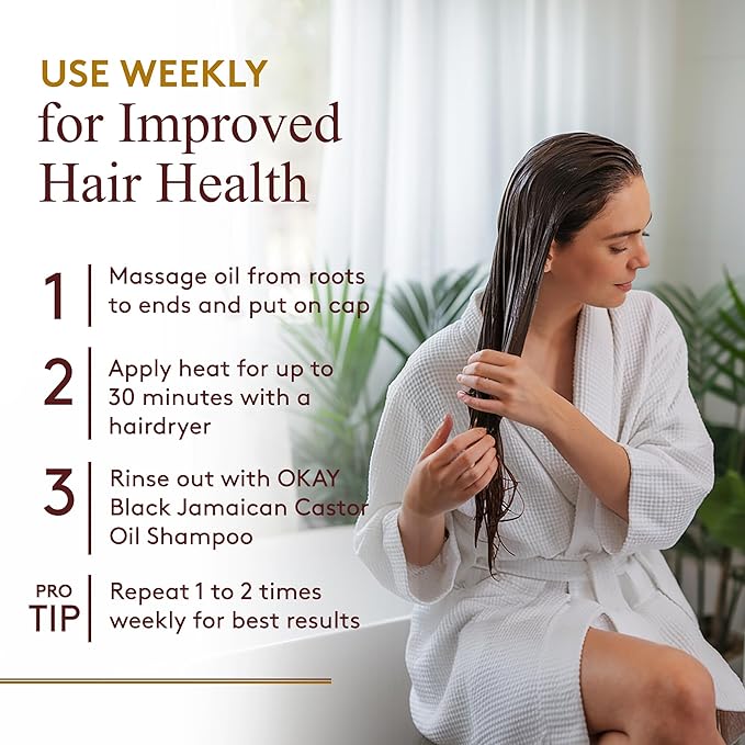 • Easy to Use - Apply as a leave-in or for deeper treatment, cover with a cap, add heat for 30 mins, then rinse. For best results, use with OKAY Black Jamaican Castor Oil Shampoo