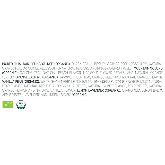 • LOTUS COLLECTION, a curated assortment of five relaxing hot teas for mind, body & spirit - a unique and unprecedented gourmet collection of highest-grade, small-lot, certified organic teas: Vanilla Pear, Orange Jasmine, Mountain Oolong, Darjeeling Quince, Lemon Lavender. Perfect tea gift for Mother's Day.
