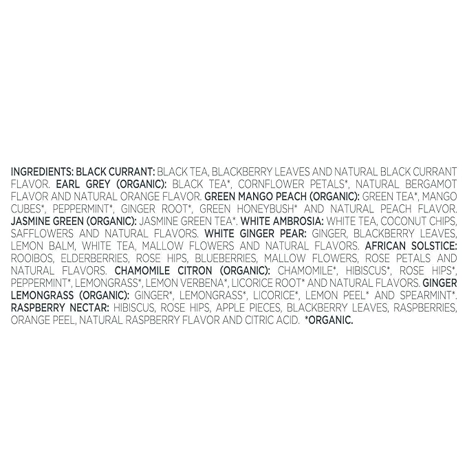 • TEA TASTING ASSORTMENT with ten varieties of our most popular flavored tea blends - African Solstice (herbal tea), Black Currant (black tea), Chamomile Citron (herbal tea), Earl Grey (black tea), Ginger Lemongrass (herbal tea), Green Mango Peach (green tea), Jasmine Green (green tea), Raspberry Nectar (herbal tea), White Ambrosia (white tea), and White Ginger Pear (white tea)