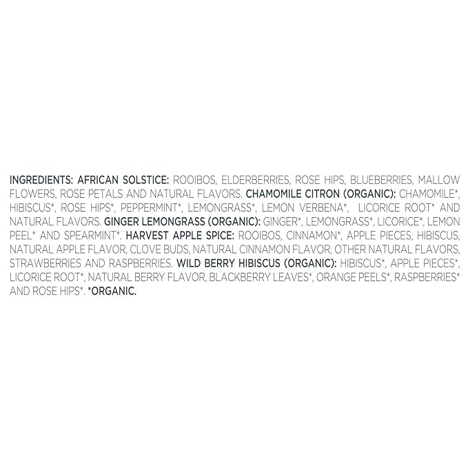 • HERBAL TEA ASSORTMENT with five varieties of our most popular, naturally caffeine-free, herbal tea blends - African Solstice, Chamomile Citron, Ginger Lemongrass, Harvest Apple Spice and Wild Berry Hibiscus.