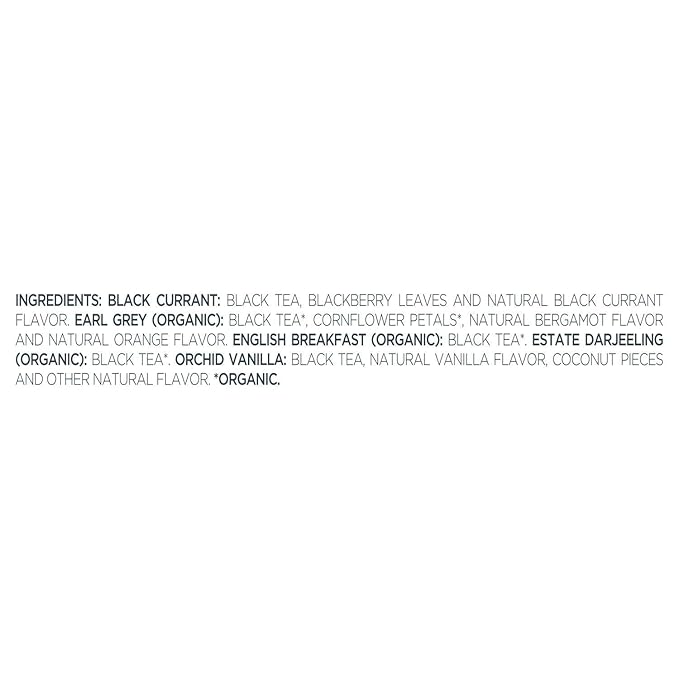 • BLACK TEA ASSORTMENT with five varieties of our most popular black tea blends - Earl Grey, English Breakfast, Estate Darjeeling, Black Currant, Orchid Vanilla.