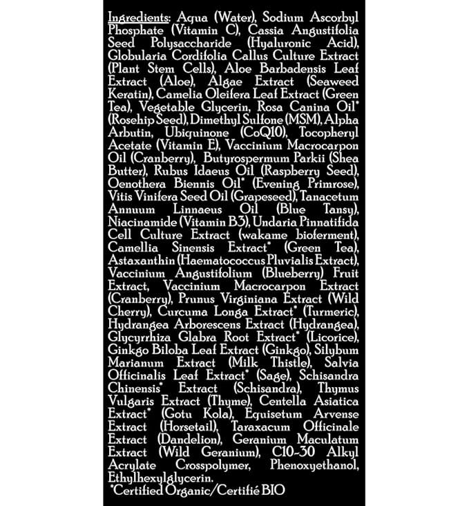 • Key Ingredients: All Natural & Certified Organic ingredients, including Plant Stem Cells, Vitamin C, MSM, hyaluronic acid and green tea.