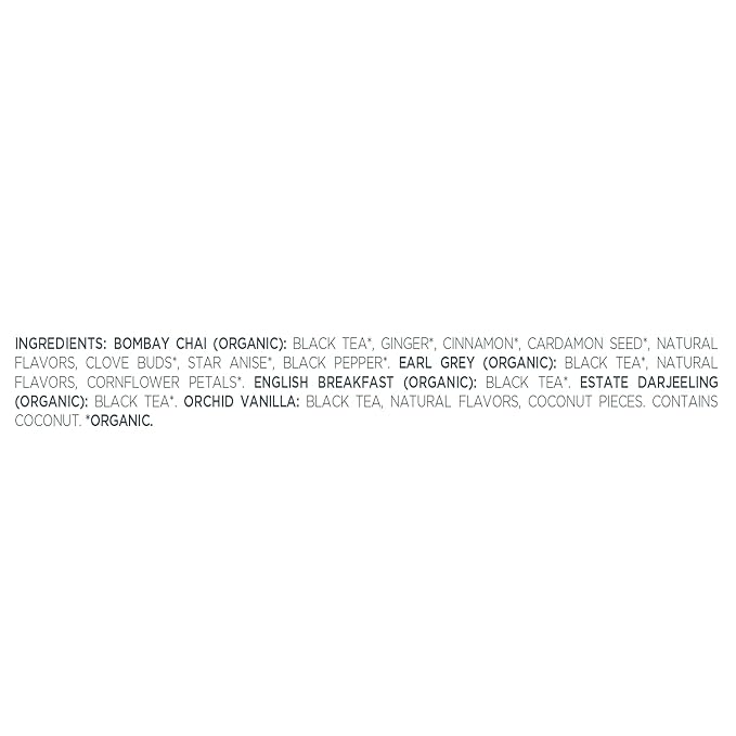 • ORGANIC BLACK TEA SAMPLER with five varieties of the world's finest black tea blends - Bombay Chai, Earl Grey, English Breakfast, Estate Darjeeling, Orchid Vanilla.