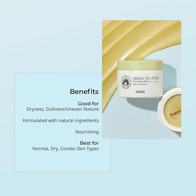 • YADAH GREEN TEA PURE CLEANSING BALM II (100ml/3.38fl oz) - This cleansing balm effectively melts away stubborn makeup and impurities without stripping moisture. Ideal for all skin types, it leaves skin refreshed, smooth, and deeply cleansed.