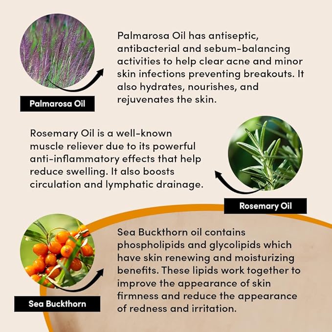 • Soothes and Calms: Sandalwood, Myrrh, and Rosemary oils offer deep soothing properties for dry, sensitive, and inflamed skin. These oils also have uplifting and balancing effects, reducing puffiness and calming the mind while healing chapped or cracked skin.