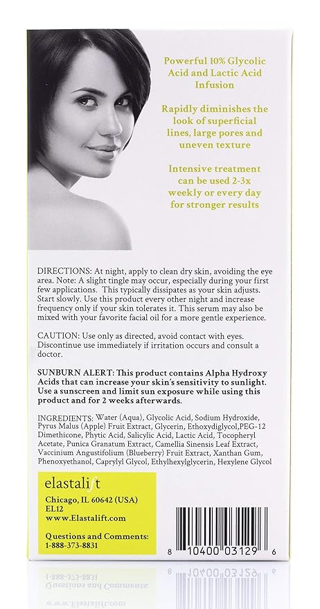 • UNCOVER A COVETED COMPLEXION – Retexturize, resurface, and reveal luminous skin with 1 simple treatment! Elastalift’s glycolic acid chemical face peel quickly and effectively eradicates your biggest insecurities, including age spots, hyperpigmentation, acne scars, and more.
