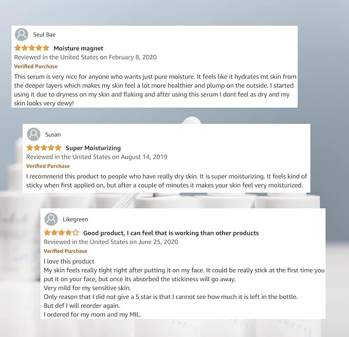 • ✔️ NATUALLY DERIVED HYALURONIC ACID: Moisturizes deeply from the bottom layer of the skin cells by attracting and holding moisture. The hyaluronic acid formula forms a hydrating layer which protects skin from irritation and dirt. The hydrating serum ampoule will deeply hydrate skin, revealing a youthful glow by stimulating cell regeneration and collage production. The signs of aging fine lines and s is going to be a thing of the past! The face serum will improve overall skin health.