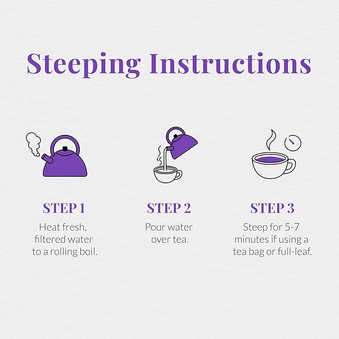 • STEEPING INSTRUCTIONS: Heat fresh, filtered water to boiling. Place one tea bag in your cup and pour in 6 oz of the heated water. Steep for 5-7 minutes. Remove the tea bag and enjoy. For iced tea, double the amount of tea bags used, steep as above and pour over a generous amount of ice.