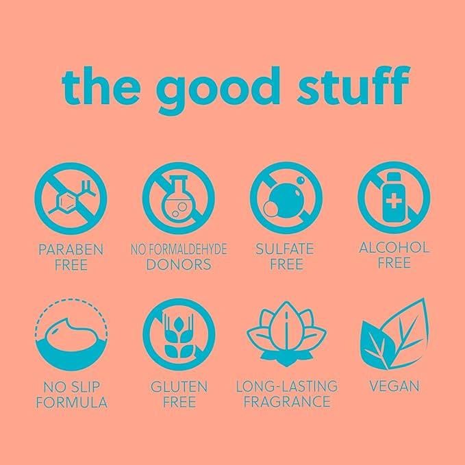 • Vegan, paraben free, sulfate free, alcohol free, no formaldehyde donors, has a no-slip formula and long-lasting fragrance
