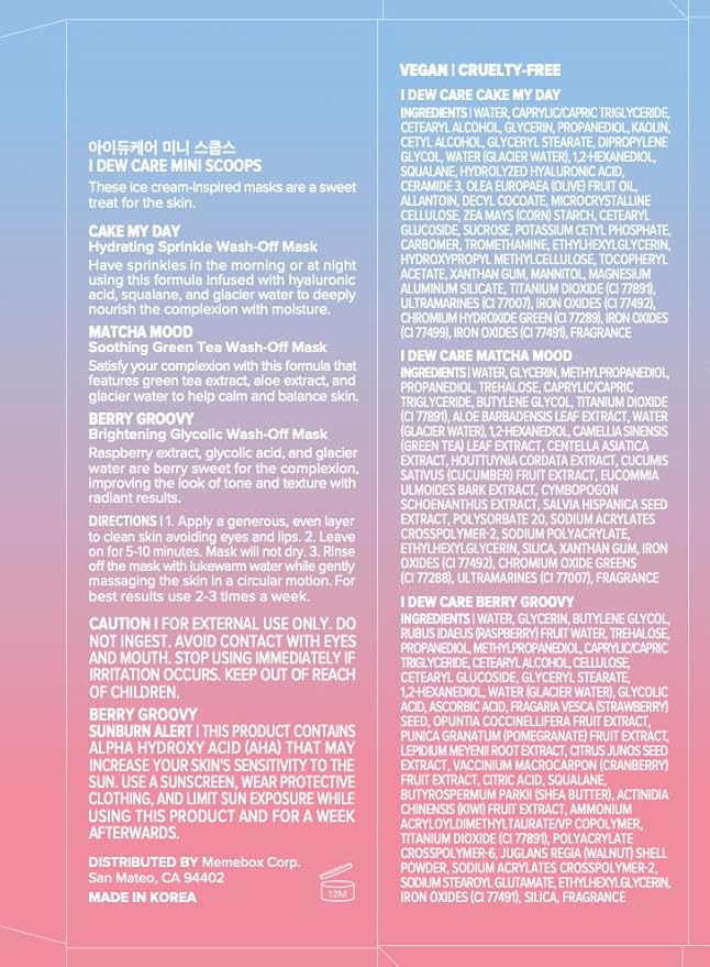 I DEW CARE Wash Off Face Mask Gift Set - Mini Scoops | Hyaluronic Acid, Korean Self Skincare, Facial Treatment, Vegan, Cruelty-Free, Paraben-Free, Exfoliating, Soothing, Mother's Day Gift