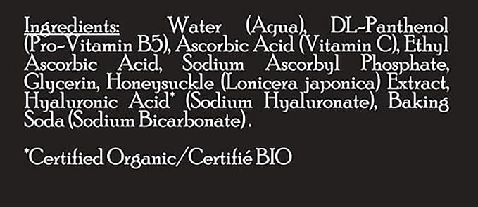 • Key Ingredients: Natural & Organic Certified ingredients, including Ascorbic Acid (Vitamin C), Glycerin, and Honeysuckle (Lonicera japonica).