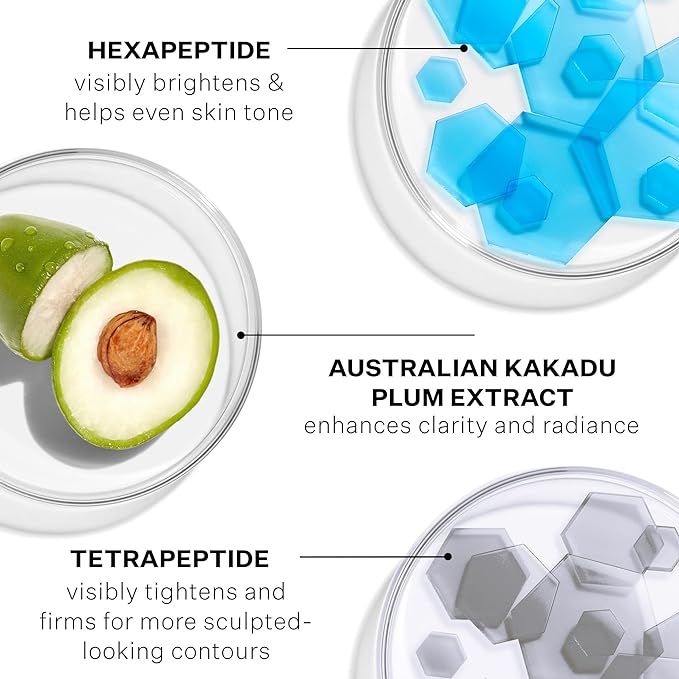 • Hexapeptides, vitamin C-rich Australian Kakadu Plum Extract and naturally-derived brighteners