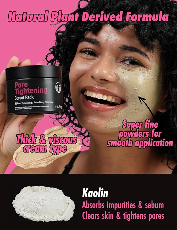 - Product Benefits : MEDITIME Pore Corset Pack brilliantly merges powerful components like Kaolin and Bentonite with enriching extracts like Red Bean powder and Amino Acids. This exceptional blend not only guarantees to proficiently minimize pores and manage sebum but also indulges your skin with essential moisture and gentle exfoliation. MEDITIME Pore Corset Pack brilliantly merges powerful components like Kaolin and Bentonite with enriching extracts like Red Bean powder and Amino Acids. This exceptional blend not o… See more