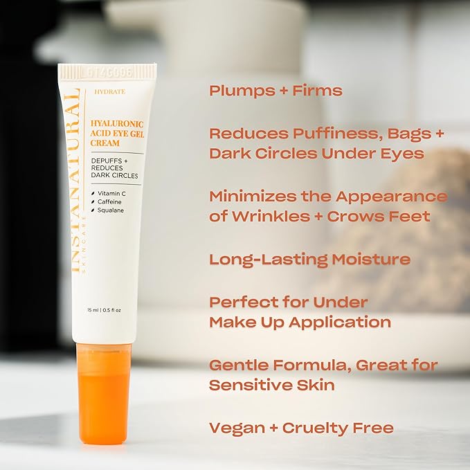InstaNatural Hyaluronic Acid Eye Gel Cream, Hydrating Under Eye Cream for Women & Men, Decreases Puffiness, Dark Circles and Wrinkles, with Vitamin C, Caffeine, Squalane & Peptides, 0.5 Fl Oz
