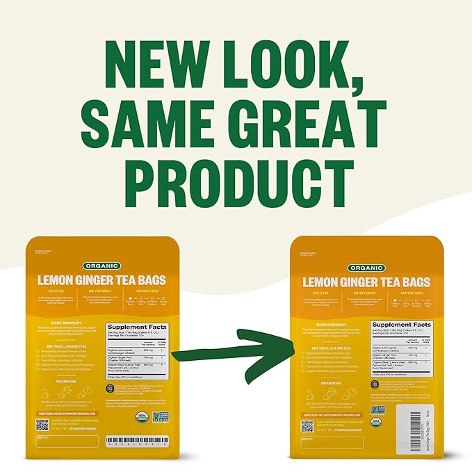 FGO Organic Lemon Ginger Tea, 100 Count, Eco-Conscious Tea Bags, Resealable Bag, Caffeine Free, Packaging May Vary (Pack of 1)