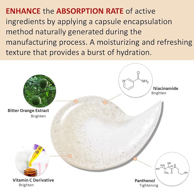 • 🌿HIGHLIGHTS:1) Vitamin C-rich bitter orange extract (Poncirus trifoliate C) helps reduce dark spots and freckles. 2) Containing Niacinamide, Arbutin, and Vitamin C, this facial serum provides an intense brightening skin care. 3) Clinically proven to reduce dark spots and freckles by 44.3% after 4 weeks of use. 4) The micro-capsules inside the formula are filled with bitter orange extract, Vitamin C, and Vitamin E. 5) Certified by EVE VEGAN; no animal testing and contains no animal ingredients.