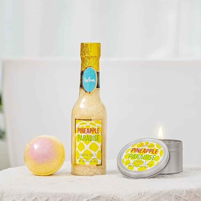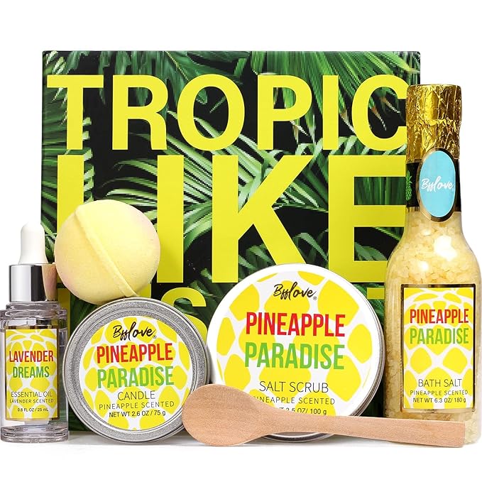 • Pineapple Spa Set for Women: Our luxury spa kit formulated with enriching shea butter and vitamin E, which helps moisturize and soften dry skin
