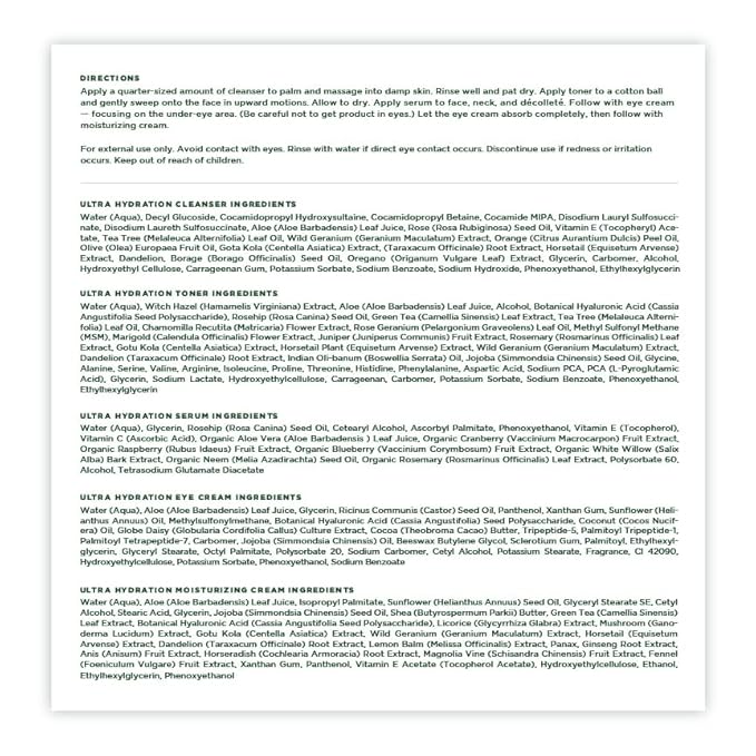 - Our full Ultra Hydration collection for your softest, smoothest skin yet: Ultra Hydration Cleanser is powered by aloe, vitamin E, rosehip, and sweet orange; Ultra Hydration Toner delivers a soothing dose of hyaluronic acid and clarifying witch hazel; Ultra Hydration Serum is packed with rich, moisturizing ingredients; Ultra Hydration Eye Cream smooths and soothes under-eyes; Ultra Hydration Moisturizing Cream provides an extra dose of nourishment for long-lasting hydration