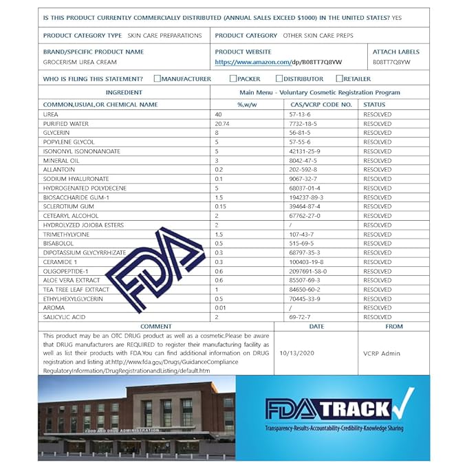 - 【Organic Ingredients】Water, Urea, Glycerin, Propylene Glycol, Isononyl Isononanoate, Mineral oil, Allantoin, Hyaluronic Acid, Hydrogenated Polydecene, Salicylic acid,Biosaccharide Gum-1, Sclerotium Gum, Cetearyl Alcohol, Trimethylglycine, Bisabolol, Dipotassium Glycyrrhizate, Ceramide 1, Oligopeptide-1, Aloe Vera extract, Tea Tree Leaf Extract, Ethylhexylglycerin, Aroma, Hydrolyzed Jojoba Esters
