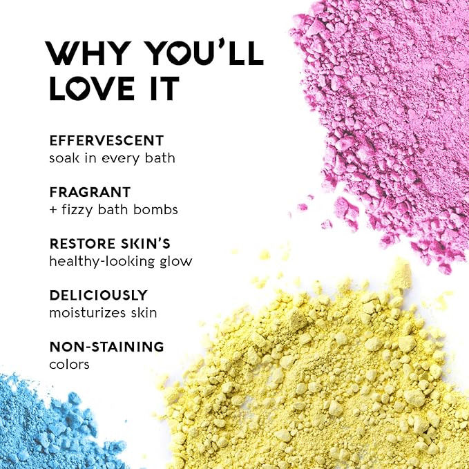 • Playful Escape: Fizzing bath bombs transform your tub into a vibrant, rainbow-filled soak