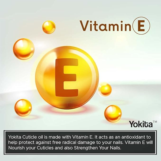 • Yokita Cuticle oil is made with Vitamin E. It acts as an antioxidant to help protect against free radical damage to your nails. Vitamin E will Nourish your Cuticles and also Strengthen Your Nails.