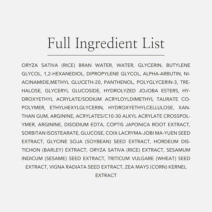 • Key Ingredients: Rice Water 68%: Moisturizing, hydration and glowing. Alpha-Albutin 2%: Radiance, dark spots, skin protection and pigmentation. Niacinamide: Skin tone, skin barrier and acne care.