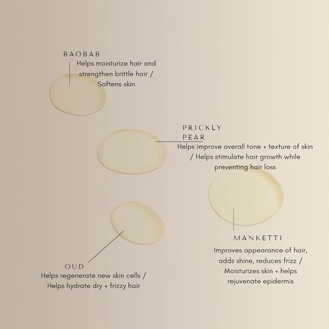 - KEY INGREDIENTS: Baobab (helps moisturize hair and strengthen brittle hair / softens skin) + Prickly Pear (helps improve overall tone + texture of skin / helps stimulate hair growth while preventing hair loss) + Manketti (improves appearance of hair, adds shine, reduces frizz / moisturizes skin + helps rejuvenate epidermis) + Oud (helps regenerate new skin cells / helps hydrate dry + frizzy hair) + Moroccan Rose (helps hair growth + damaged hair / reduces appearance of redness on skin)