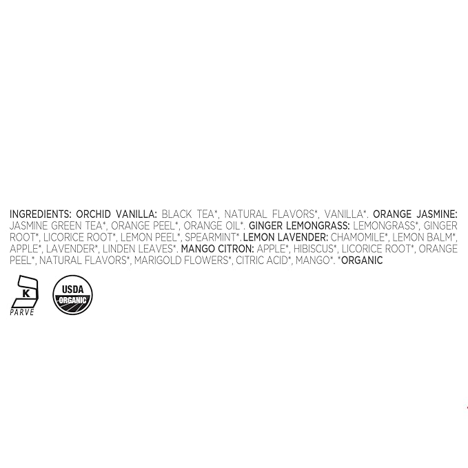 - PETITE PRESENTATION BOX tea sampler has 10 pyramid infusers, two each of the following blends: Orchid Vanilla (Black tea), Orange Jasmine (Green tea), Ginger Lemongrass (Herbal tea), Lemon Lavender (Herbal tea), and our newest blend, Mango Citron (Herbal tea).