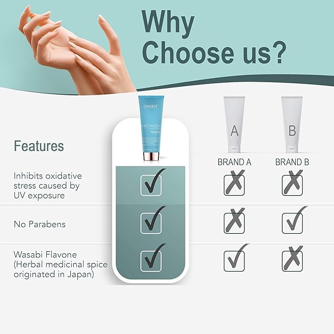 - 【NATURALLY ENRICHED HAND CREAM】- Onsen's white pagoda hand cream is infused with Japanese pagoda tree flowers, Wasabi Flavone, Shea Butter and Hyaluronic Acid that reduces irritation and redness, clarifies skin imperfections, leaves hands feeling ultra-smooth and hydrated, keeps skin plump and hydrated