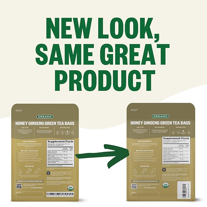 FGO Organic Honey Ginseng Green Tea, 100 Count, Eco-Conscious Tea Bags, Resealable Bag, Packaging May Vary (Pack of 1)
