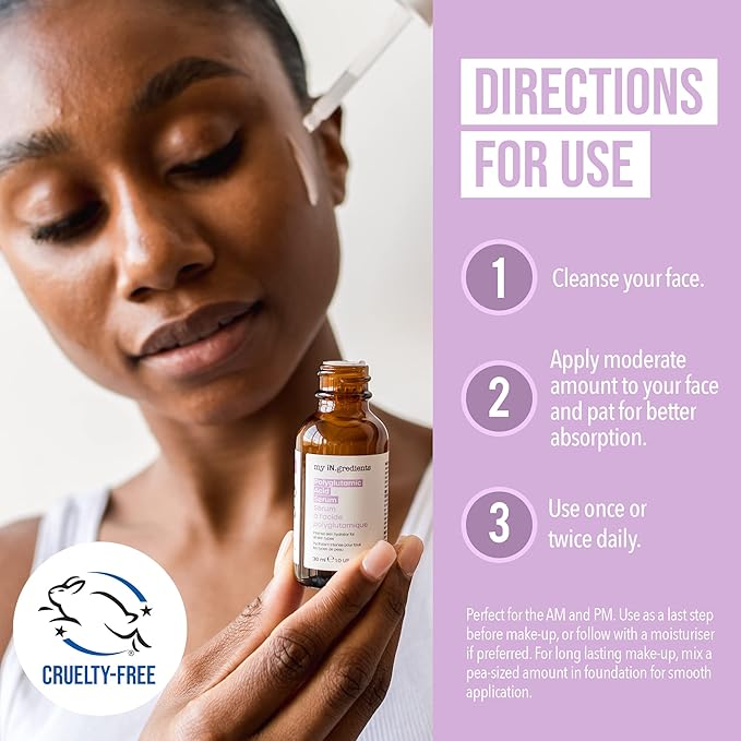 • The Polyglutamic Acid Serum has a serious skin-replenishing formula designed to help fight the signs of aging while leaving your skin hydrated and plump. Polyglutamic Acid is a more powerful humectant than it's more well-known cousin, Hyaluronic Acid. The extra water-attracting properties help increase cellular volume and give skin a plump, dewy glow.