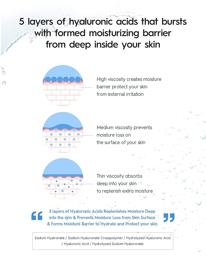 • 5 HYALURONIC ACIDS: 5 layers of hyaluronic acid replenishes moisture deep into the skin, prevents moisture loss from the skin surface, and forms a moisture barrier to hydrate and protect your skin.