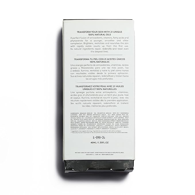 • INGREDIENTS | 21 transforming oils with antioxidants, vitamins and Bakuchiol, known as natural retinol that reduces fine lines, improves elasticity and enhances skin texture and smoothness.