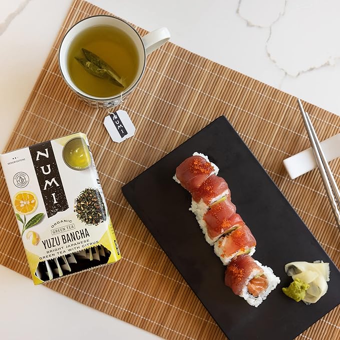 • Organic Yuzu Bancha is a special Numi blend of bancha green tea and yuzu peel; Organic green tea leaves are harvested, steamed and rolled in small batches, then roasted at medium temperature and blended with yuzu for a sweet, lemony smooth green tea
