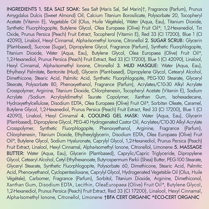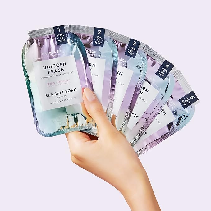 • 5 Easy Steps to Perfect Pedicures. Our Pedi in a Box Glimmer is easy to use, with 5 steps that are simple to follow. The set includes a salt soak, sugar scrub, mud masque, cooling gel mask and massage butter. This is the perfect way to get professional results from the comfort of your own home!
