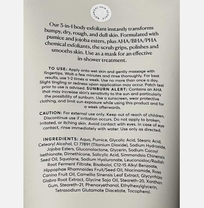 • IMPROVING TONE & TEXTURE: Our 3-in-1 KP body scrub exfoliant instantly transforms bumpy, dry, rough, and dull skin. It works to loosen, lift, & dissolve dead skin cells and clear pores