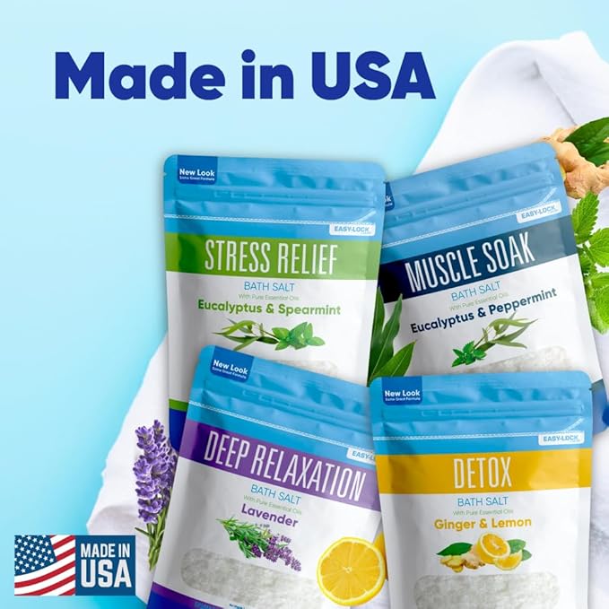 • New Epsom Salt Bath Salts Sampler Set: Deep Relaxation Bath Soak, Muscle Bath Soak, Detox Bath Soak, and Stress Relief Bath Soak