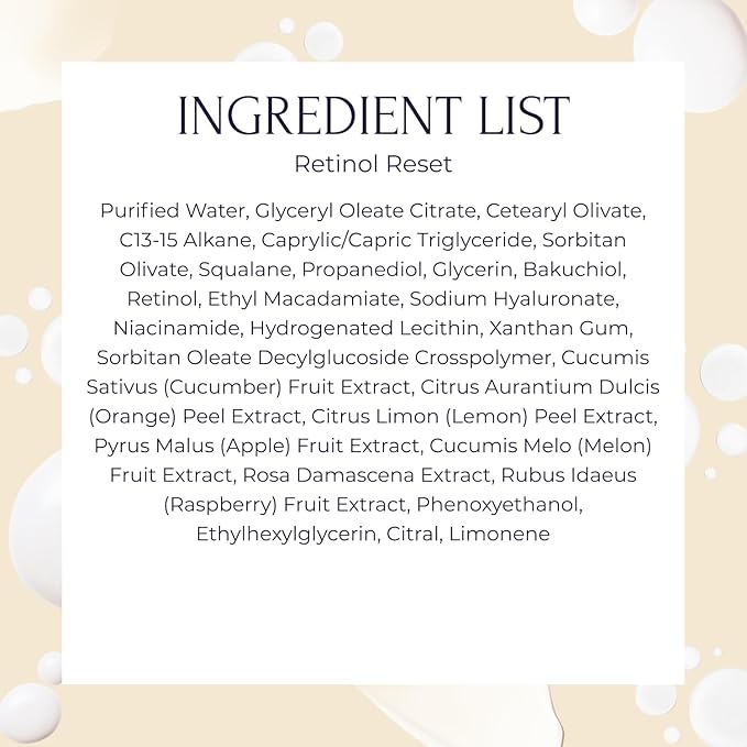- Firm, Brighten + Renew — This lightweight retinol serum for face also contains niacinamide to visibly improve hyperpigmentation and uneven skin tone. Plus, our retinoid serum has squalane for a firm, lifted complexion, hyaluronic acid for hydration, and fruit extracts for a dewy look overnight. Looking for retinol cream or retinol for face? Look no further than Retinol Reset.
