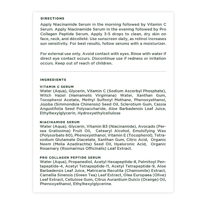 - These three serums are the solution for glowing skin. This regime uses the Niacinamide serum to add moisture and support the skin barrier, the Vitamin C serum to plump and brighten complexion, and the Peptide cream for a firm finish. This trio assists with collagen production for complexion-correcting youthful radiance.
