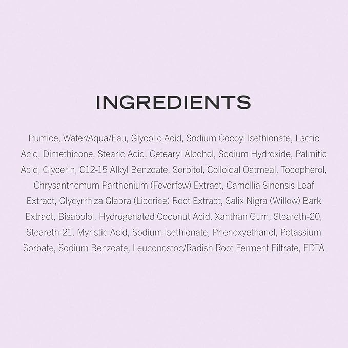 • Buff Away Dead Skin: Glycolic and Lactic Acids at a combined level of 10% help loosen skin’s top layer and decongest pores, while Pumice Buffing Beads (NOT microplastic!) whisk it all away