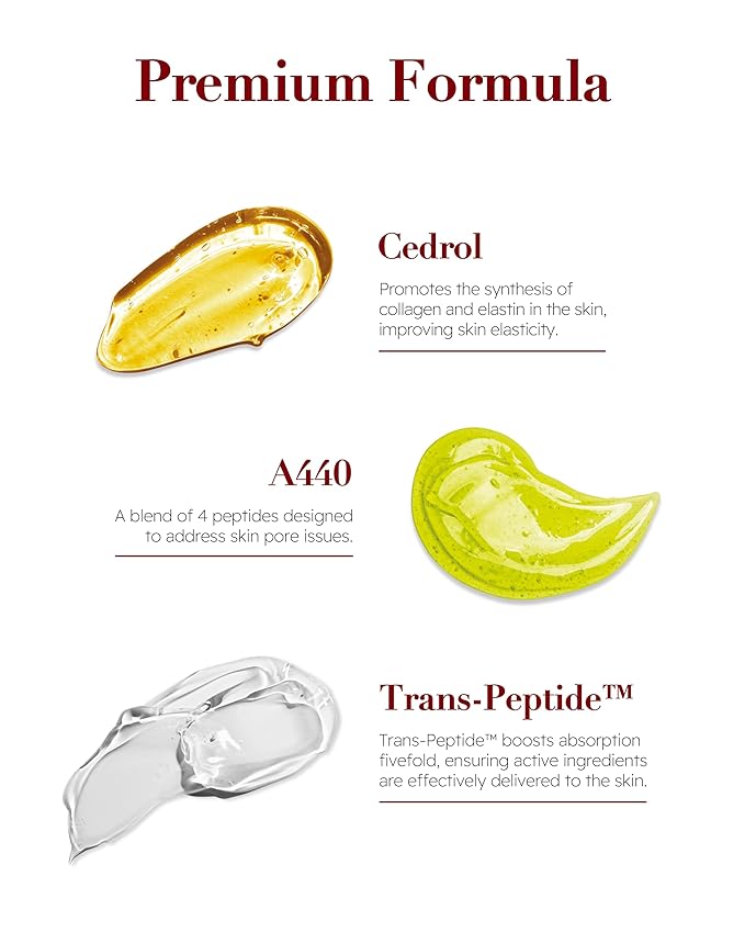 - ENHANCED ELASTICITY - Infused with Cedrol, A440, and Trans-peptide, this cream actively promotes the synthesis of collagen and elastin, resulting in enhanced skin elasticity. These key ingredients work synergistically to provide smooth skin texture and soothing effects, ensuring a revitalized complexion.