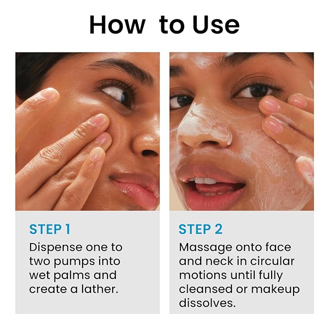 - HOW TO USE: Dispense one to two pumps into wet palms and create a lather. Gently massage onto the face and neck in small circular motions until fully cleansed or when makeup is dissolved. Rinse with water and follow with your usual skincare regimen in the morning and evening
