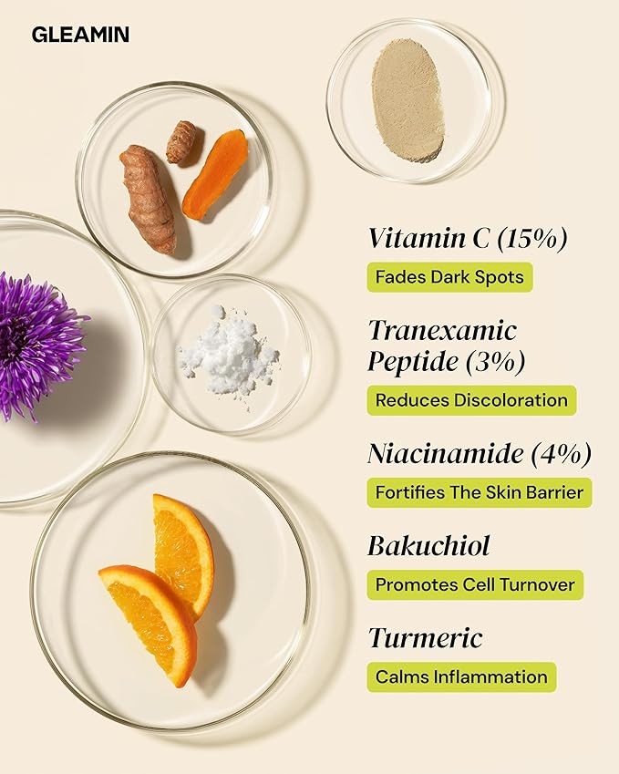 Gleamin Superactive Vitamin C Serum – 15% Vitamin C, 3% Tranexamic Acid, 4% Niacinamide & Bakuchiol – Reduces Discoloration, Uneven Tone, Brightens Skin & Smooths Texture – Fragrance-Free, 1 fl oz