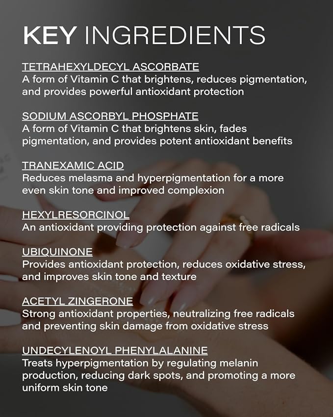 • Special Ingredients : 5% Tetrahexyldecyl Ascorbate: A stable and oil-soluble form of Vitamin C 2% Sodium Ascorbyl Phosphate: A stable form of Vitamin C 2% Tranexamic Acid 2% Hexylresorcinol Ubiquinone: Also known as Coenzyme Q10 Acetyl Zingerone Undecylenoyl Phenylalanine Tocopherol: Known as Vitamin E Acetyl Hexapeptide-8: lovingly known as “Botox in a Jar” 4% Niacinamide, TXA, Turmeric, 5% Tetrahexyldecyl Ascorbate, 2% Sodium Ascorbyl Phosphate, Vitamin C 5% Tetrahexyldecyl Ascorbate: A stable and oil-soluble form of Vitamin C 2% Sodium Ascorbyl Phosphate: A stable form of Vitamin C 2% Tranexamic Acid 2% Hexylresorcinol Ubiquinone: Also known as Coenzyme Q10 Acetyl… See more