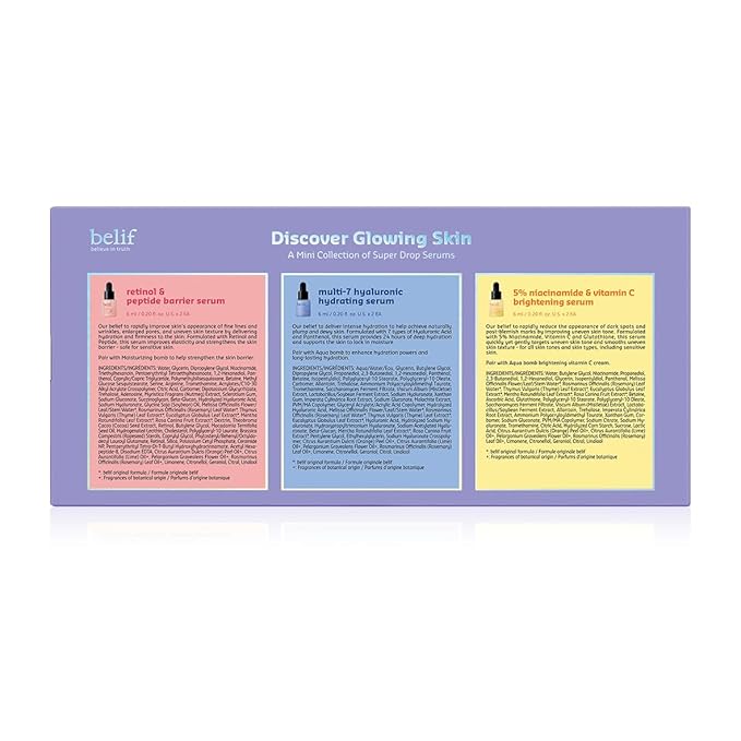 belif Discover Glowing Skin Mini Kit: Peptides Firming Serum, Multi7-Hyaluron Hydrating Serum, Vitamin C Serum, Super Drops Trial Set, Hyaluronic Acid, 5% Niacinamide, Retinol, Korean Skin Care