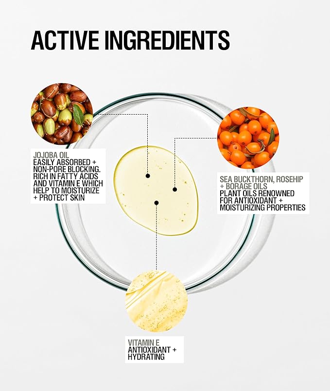 • FACIAL SERUM. Formulated with Vitamin E, Rosehip, Borago and Sea Buckthorn. Skin feels resilient, hydrated and soothed. Highly nourishing facial oil with skin renewal benefits. Suitable for all skin types.
